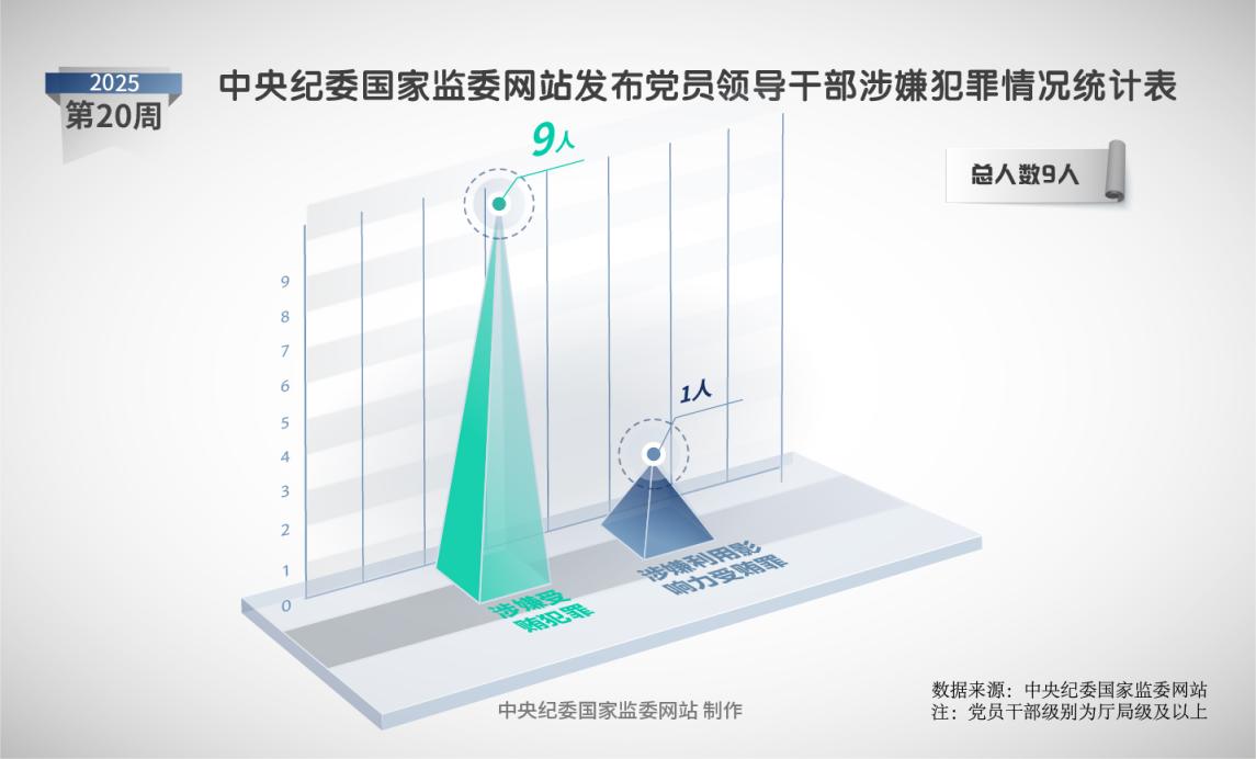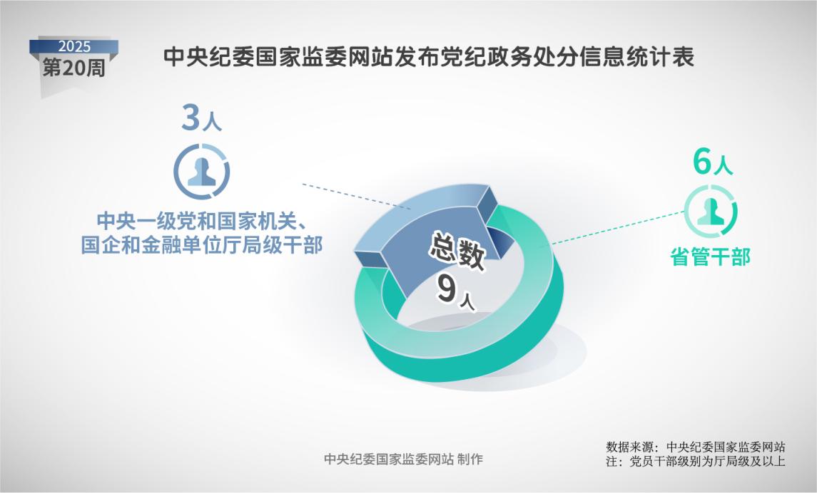 2025年第20周,中央纪委国家监委网站共发布9名党员领导干部党纪政务处分信息。其中,中央一级党和国家机关、国企和金融单位干部3人,省管干部6人。