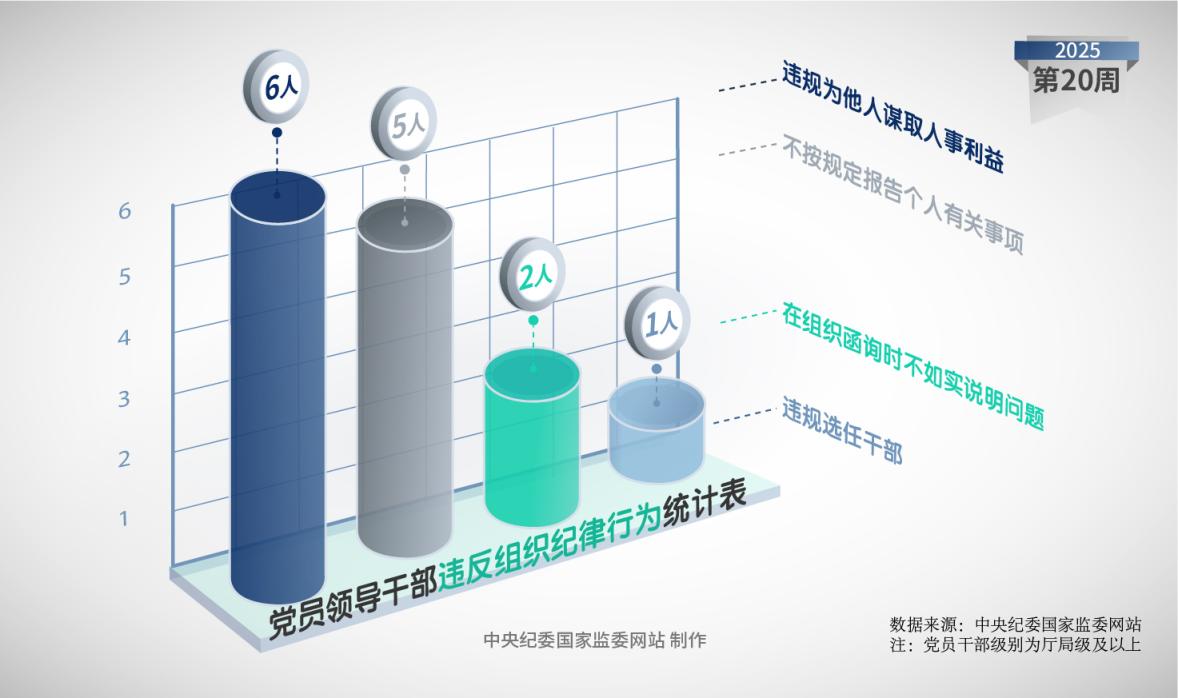 2025年第20周,中央纪委国家监委网站通报的被处分党员领导干部中,有7人存在违反组织纪律问题。其中,有6人存在违规为他人谋取人事利益行为,5人不按规定报告个人有关事项,2人在组织函询时不如实说明问题,1人违规选任干部。