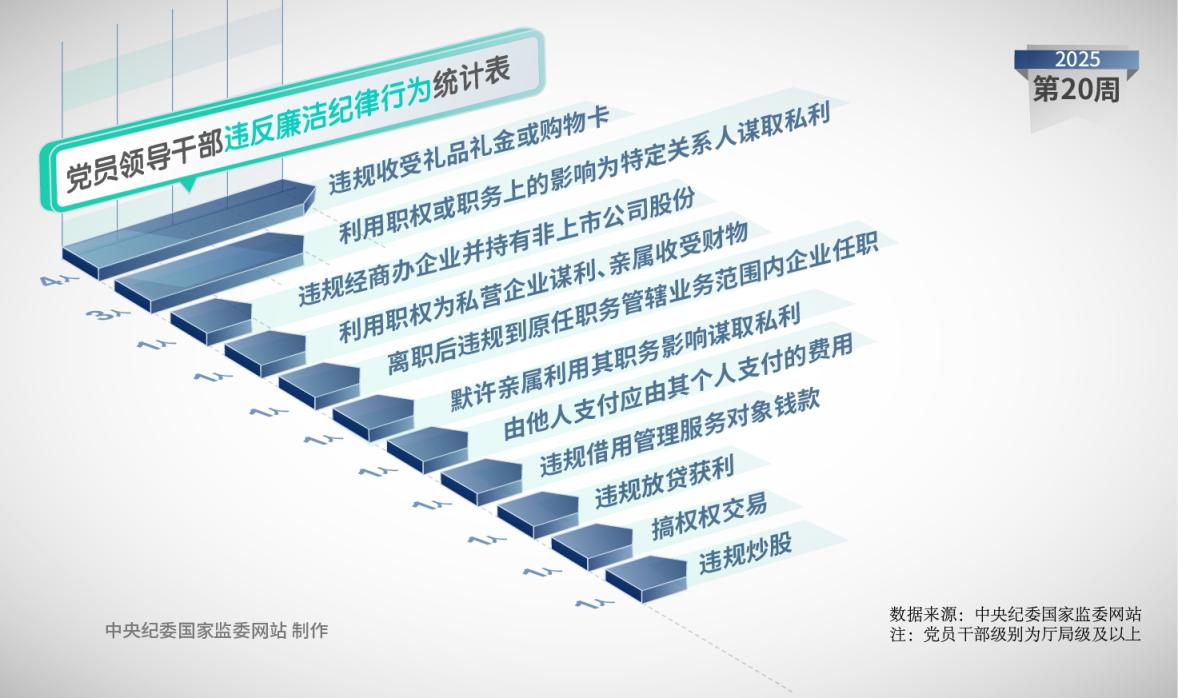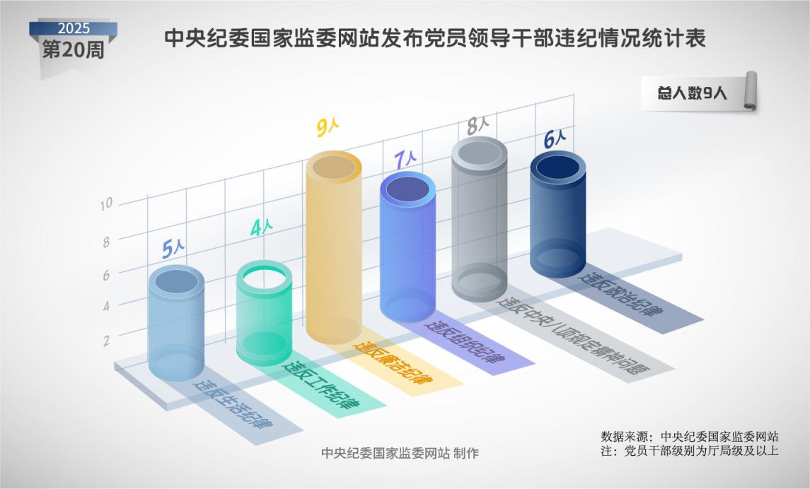 2025年第20周,中央纪委国家监委网站发布的党纪政务处分信息中,9名被处分党员领导干部均存在违反廉洁纪律问题,6人违反政治纪律,7人违反组织纪律,4人违反工作纪律,5人违反生活纪律,8人存在违反中央八项规定精神问题。