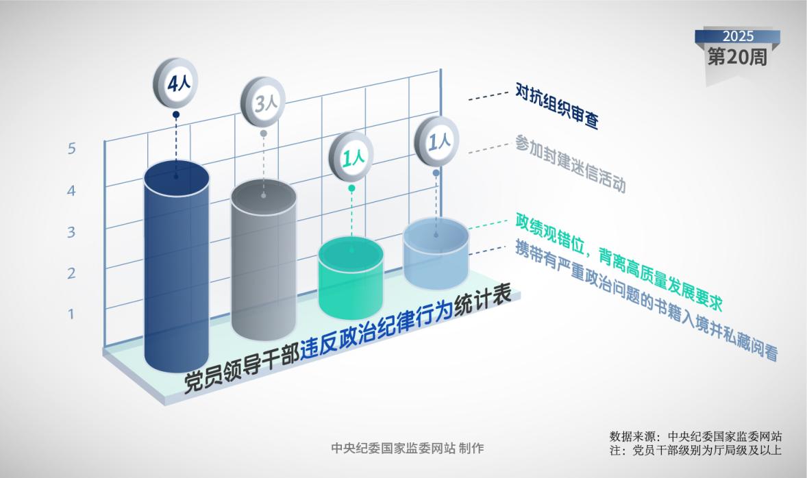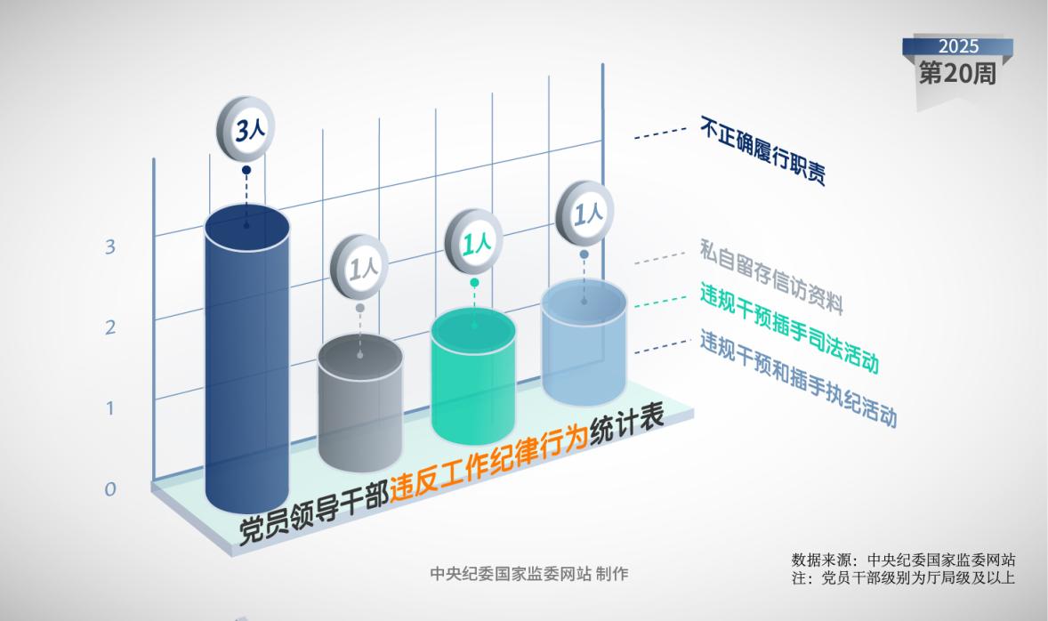 2025年第20周,中央纪委国家监委网站通报的被处分党员领导干部中,4人存在违反工作纪律问题。其中,3人存在不正确履行职责行为,1人私自留存信访资料,1人违规干预插手司法活动,1人违规干预和插手执纪活动。