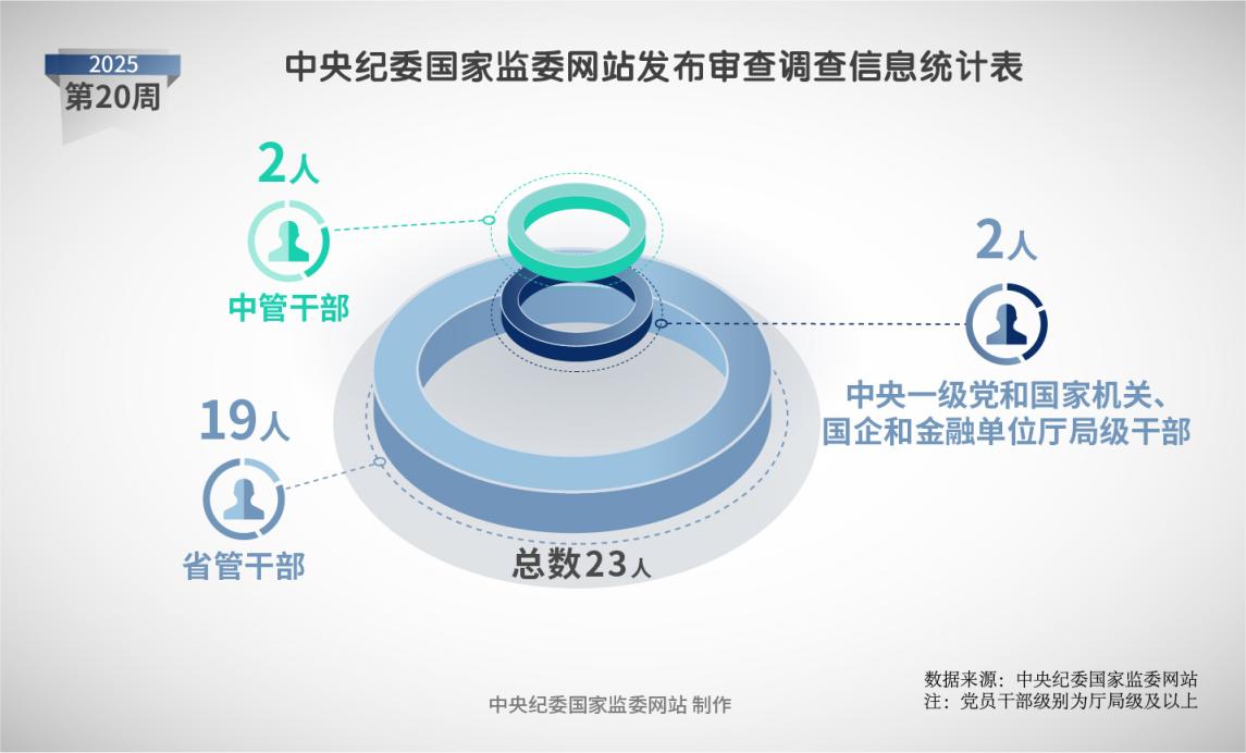 2025年第20周,中央纪委国家监委网站共发布23名党员领导干部接受审查调查信息。其中,中管干部2人,中央一级党和国家机关、国企和金融单位干部2人,省管干部19人。